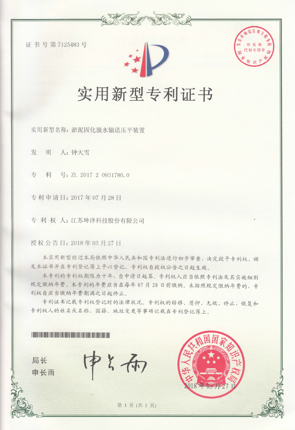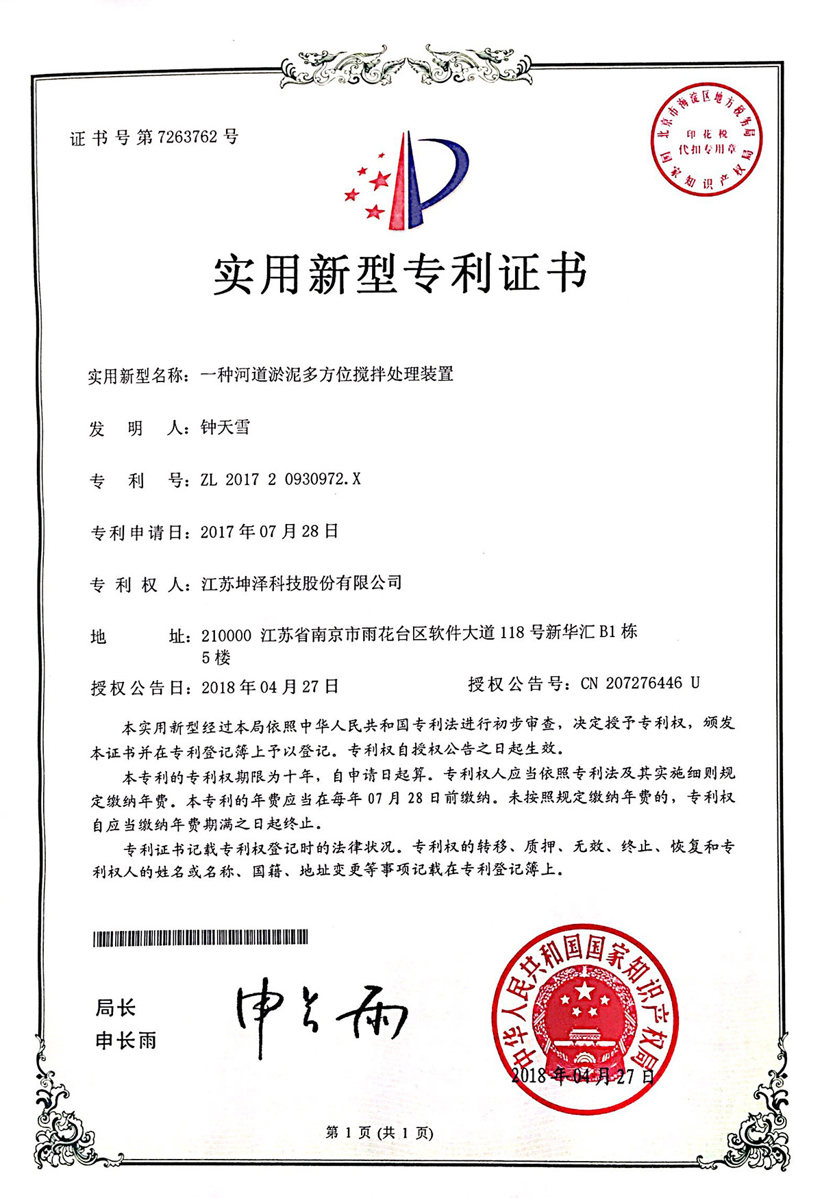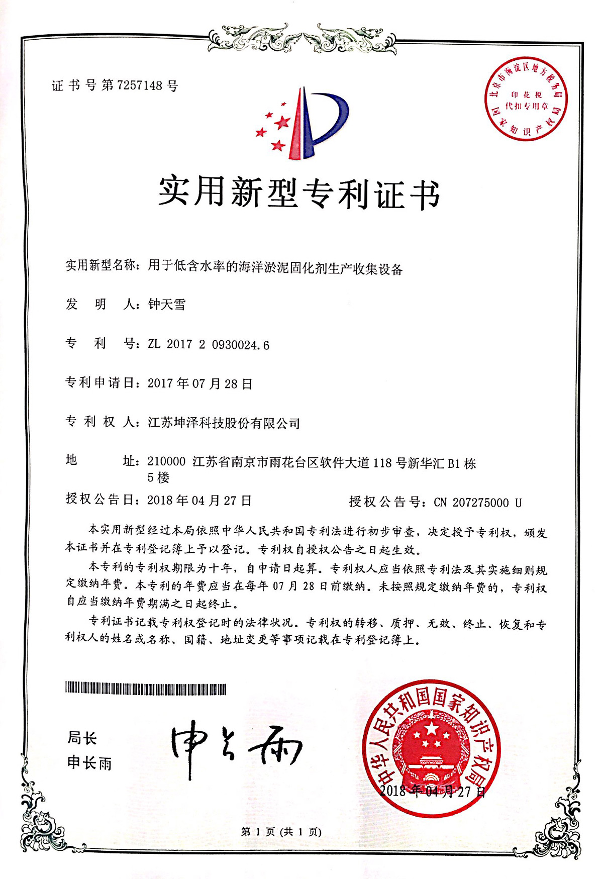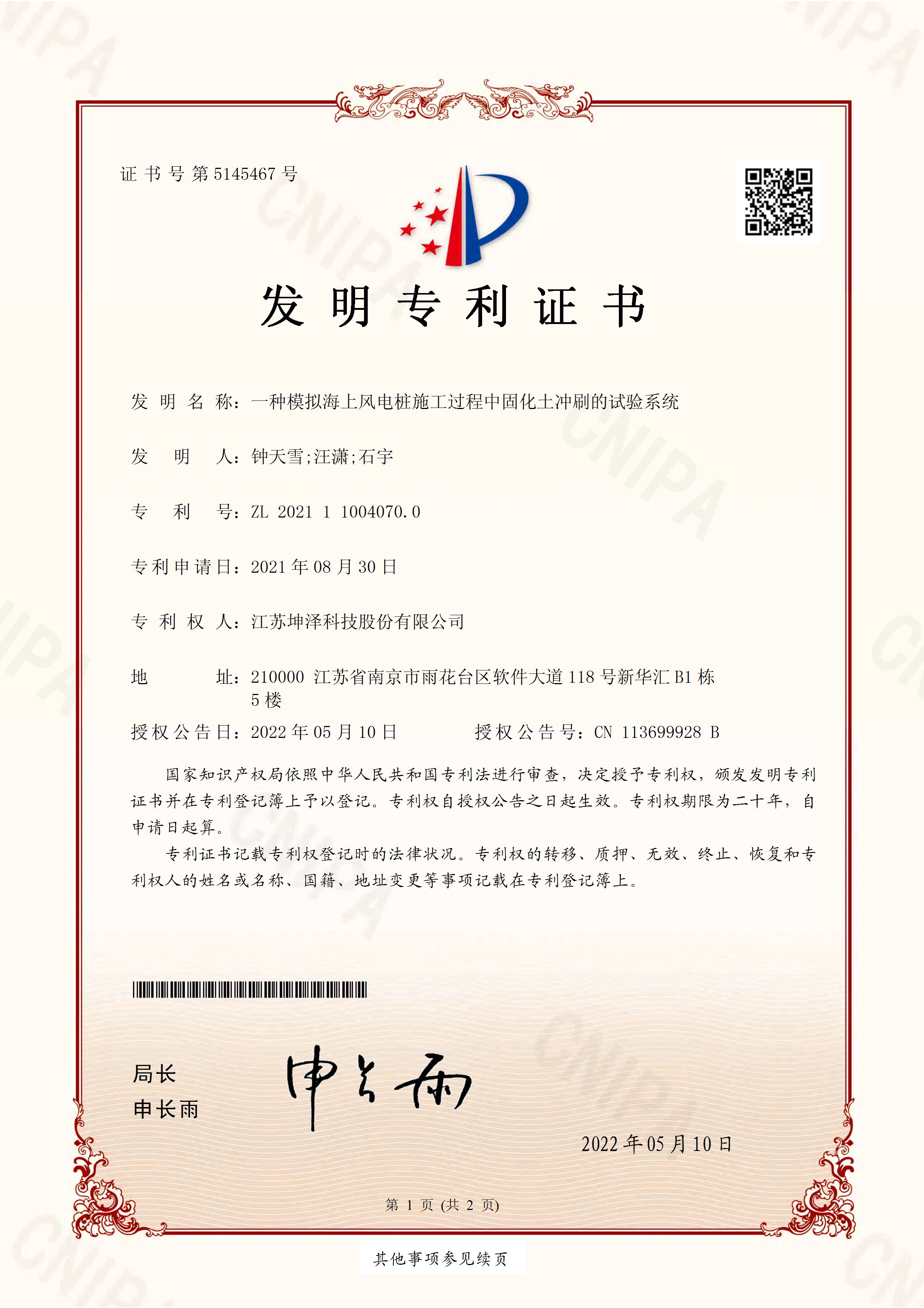 公司设有“南京(坤泽)淤泥资源化及产业化工程技术研究中心”和“连云港(坤泽)淤泥软基固化工程技术研究中心”,拥有多项专利,覆盖了固化剂、固化土产品以及施工工艺及专有生产和施工设备。