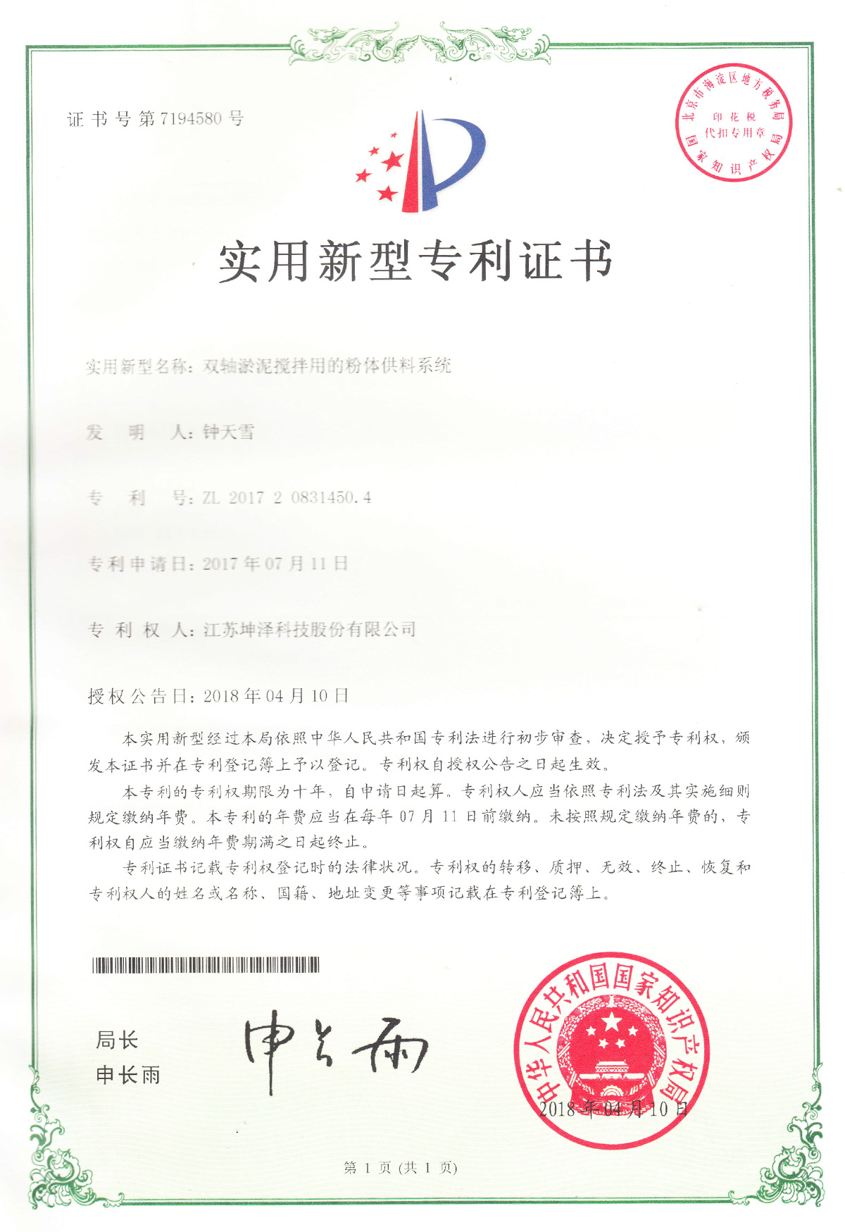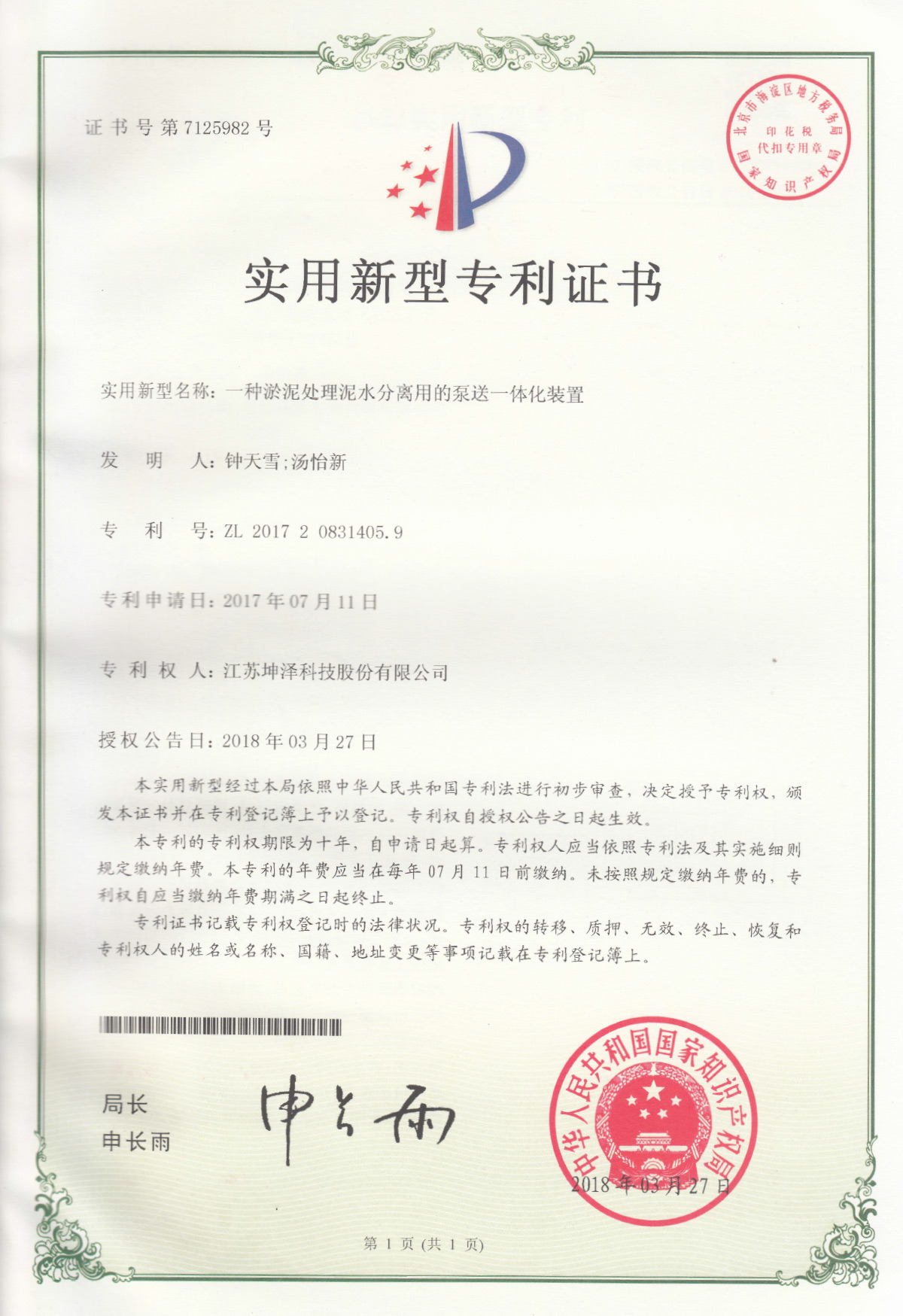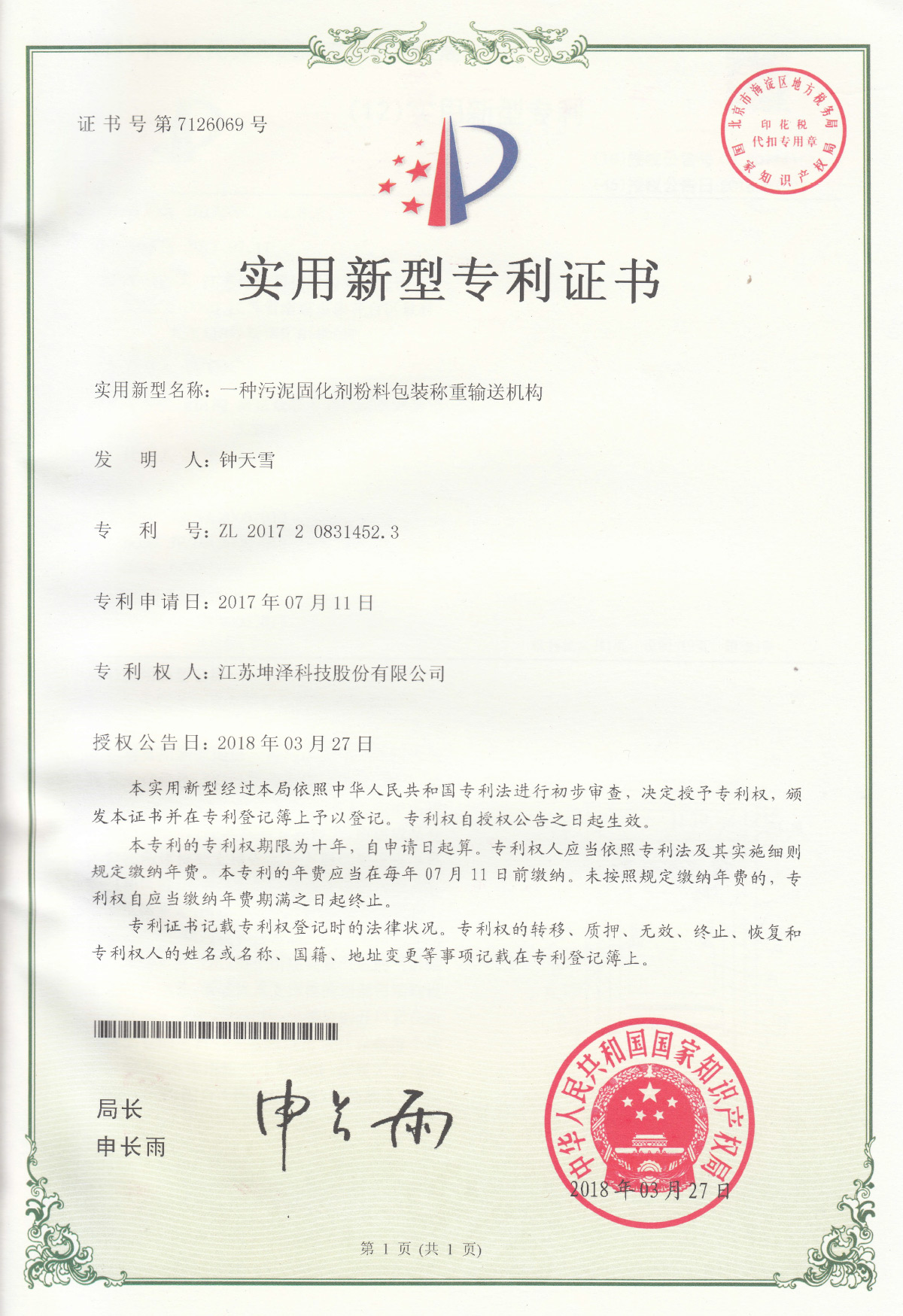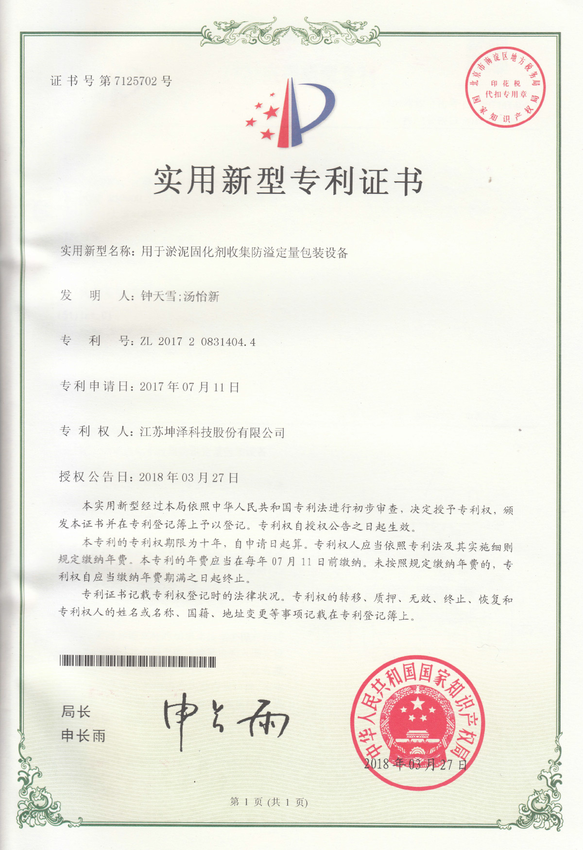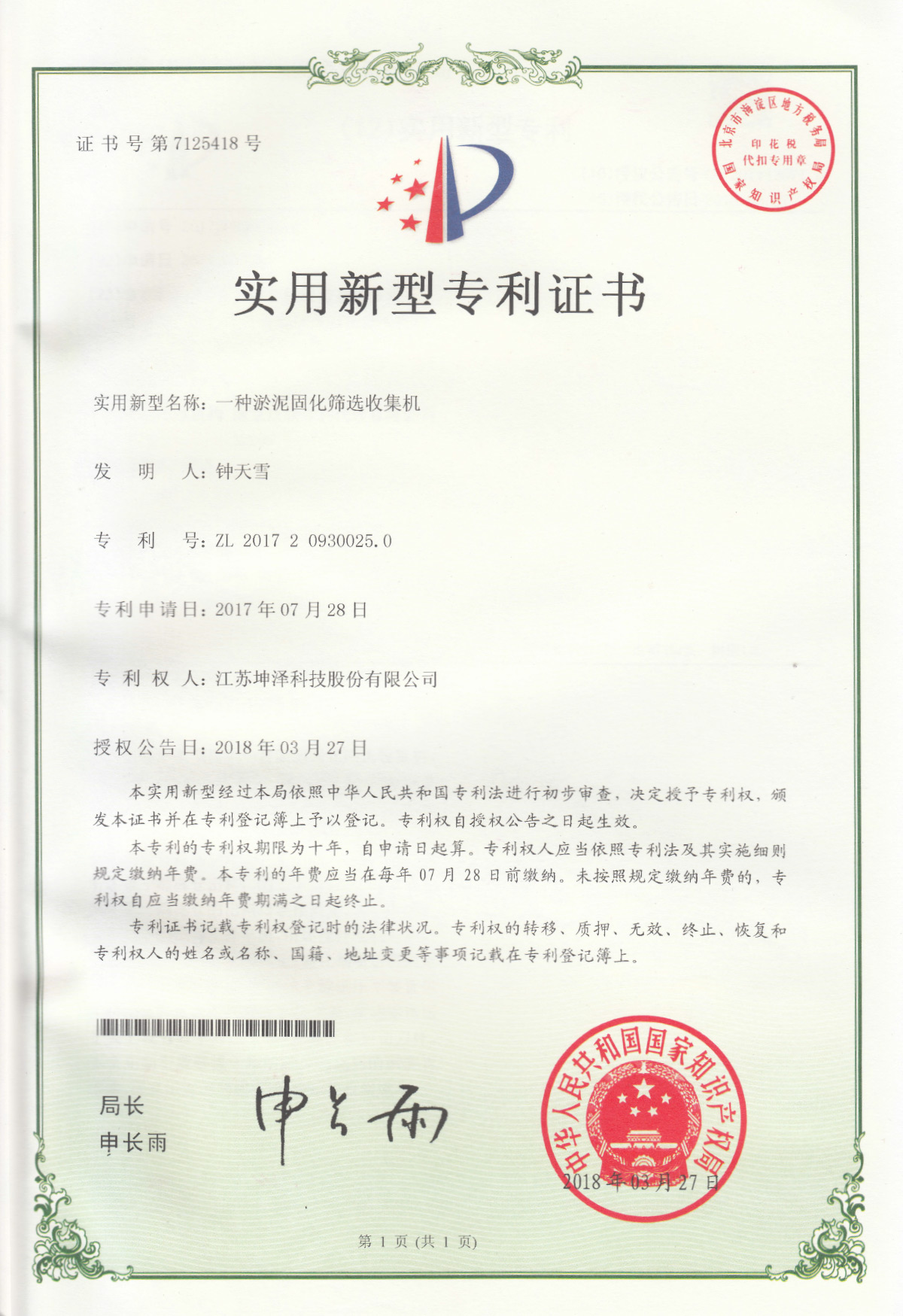公司设有“南京(坤泽)淤泥资源化及产业化工程技术研究中心”和“连云港(坤泽)淤泥软基固化工程技术研究中心”,拥有多项专利,覆盖了固化剂、固化土产品以及施工工艺及专有生产和施工设备。