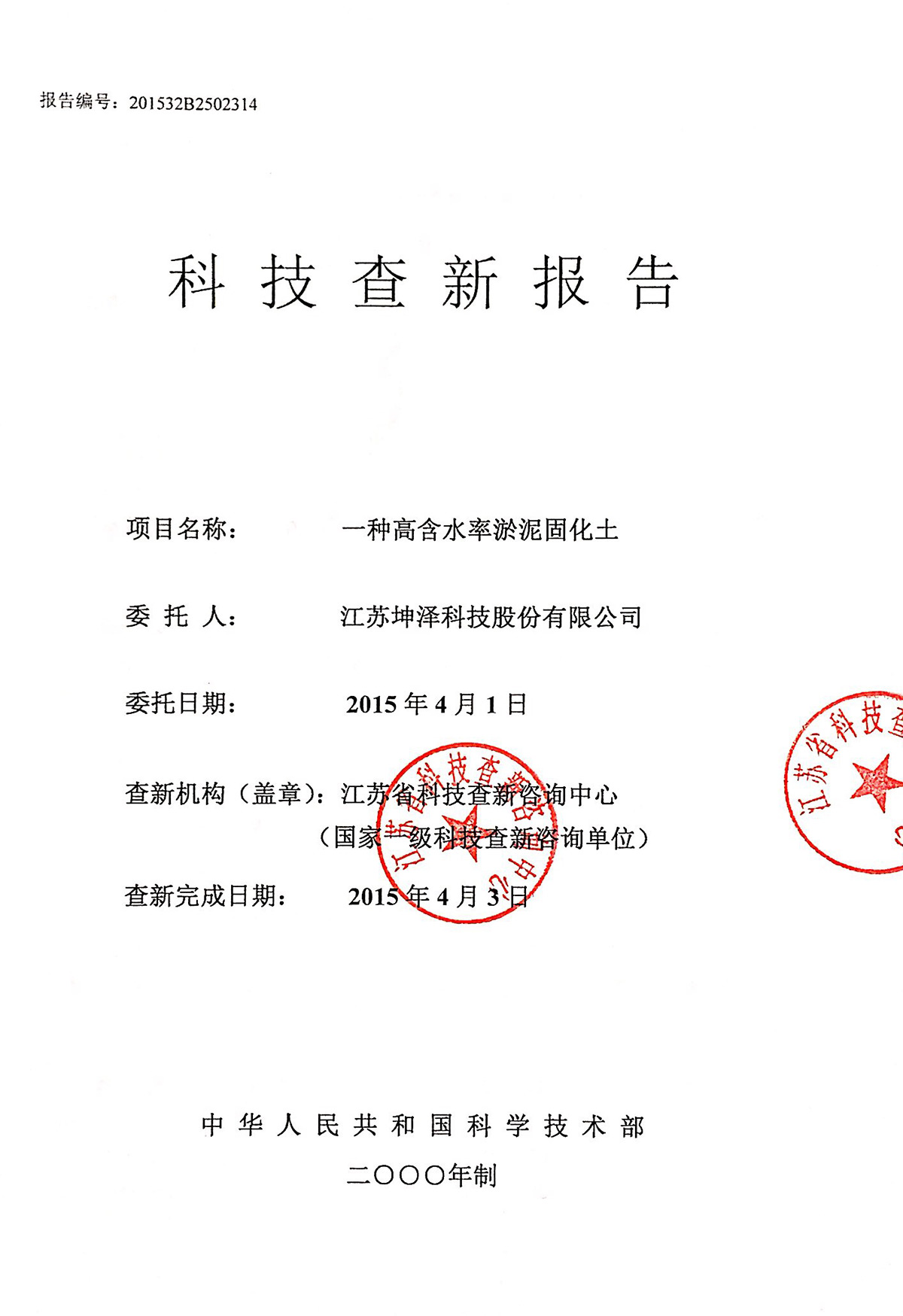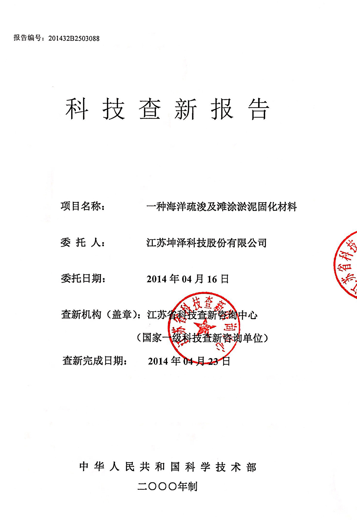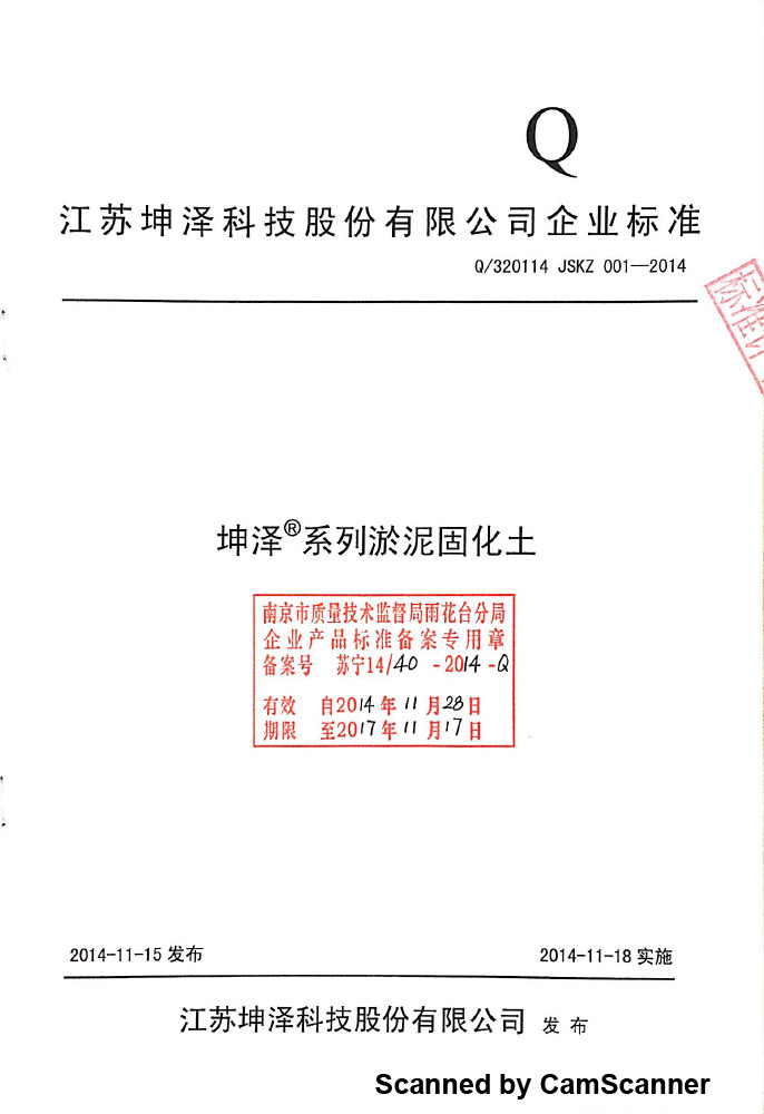 通过国家标准化机构的审核备案,建立了淤泥固化土产品的企业标准,【Q/320114 JSKZ 001-2011《坤泽®系列淤泥固化土》企业标准】(最新修订版本为Q/320114 JSKZ 001-2018《坤泽®系列淤泥固化土》),参编了《固化土道路应用技术规程》行业标准。
